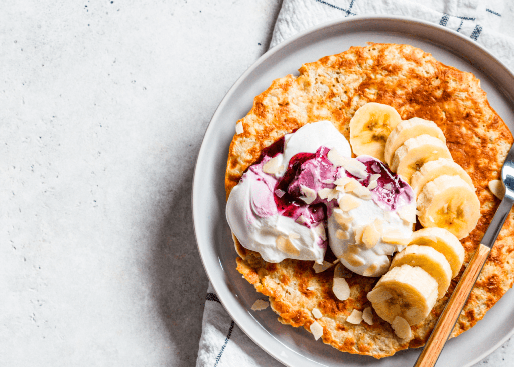 Integrar todos los ingredientes y dejarlos reposar por 10 minutos. Llevar a la sartén y esparcir muy bien para que quede una tortilla bien finta. Voltear y damos vuelta según sea necesario hasta que quede doradita. Toppings: Láminas de almendra banano picado yogur griego